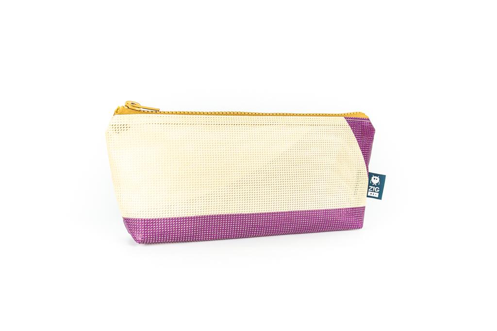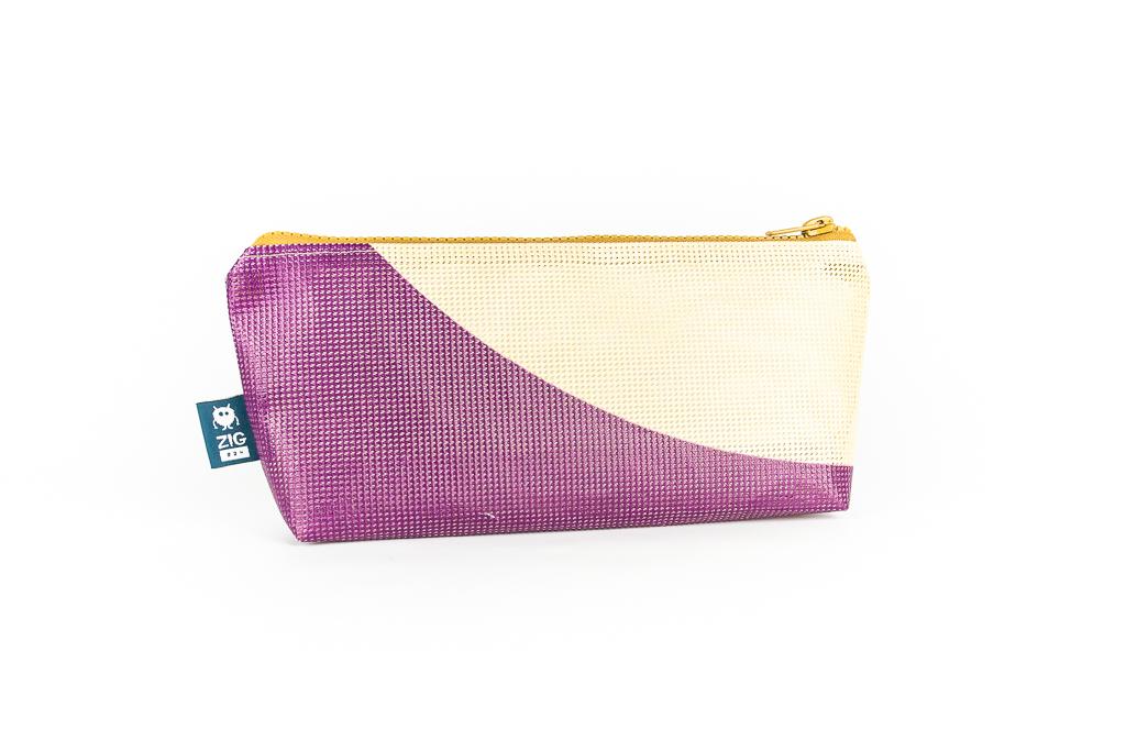 Grande trousse en bâche micro-perforée (rendu intéressant par son côté légèrement transparent). Couleur jaune et violet. Fermeture éclair dorée.