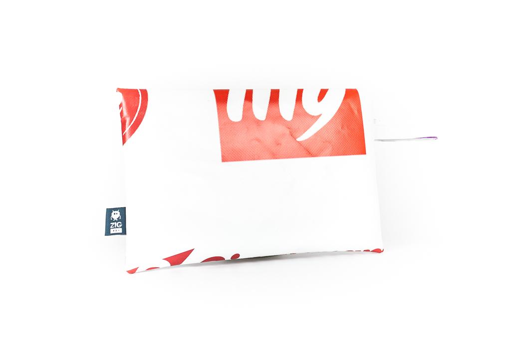 Pochette blanche avec lettres et motifs rouges. Fermeture éclair blanche. Anse sur le côté.
