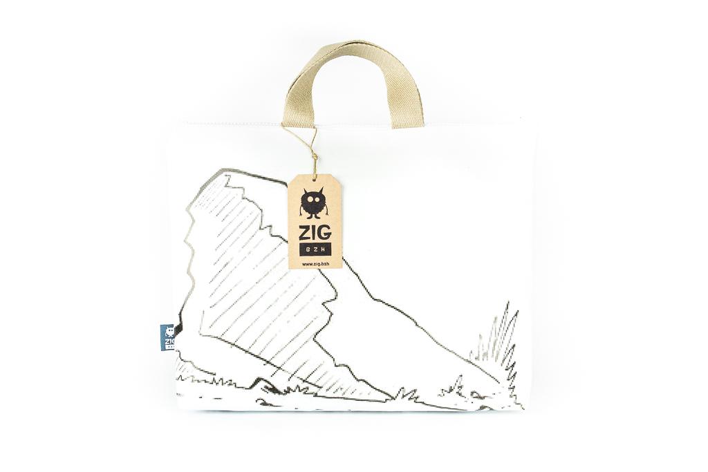 Porte-documents blanc avec dessin noir. Non doublé. Anses en coton. Fermeture éclair blanche.
