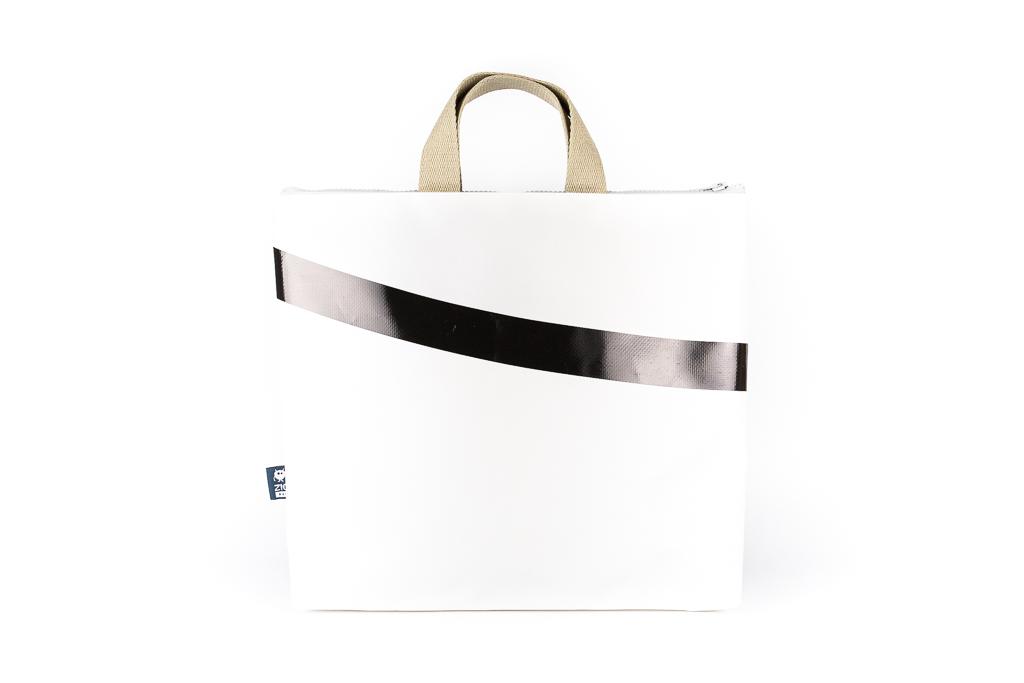 Porte-documents blanc et gris (au-dessus du trait) avec trait noir vernissé. Non doublé. Anses en coton. Fermeture éclaire grise.