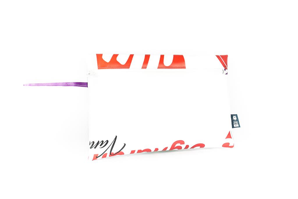 Pochette blanche avec lettres et motifs rouges. Fermeture éclair blanche. Anse sur le côté.