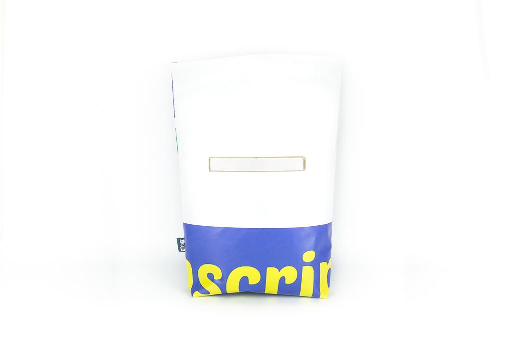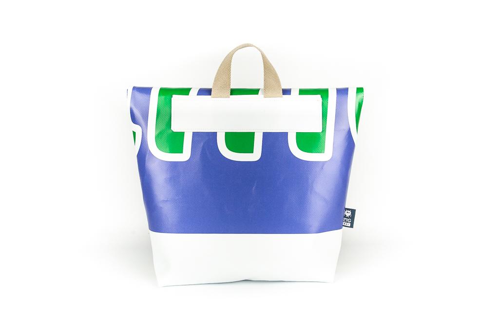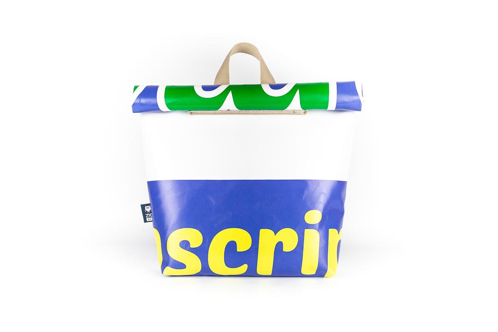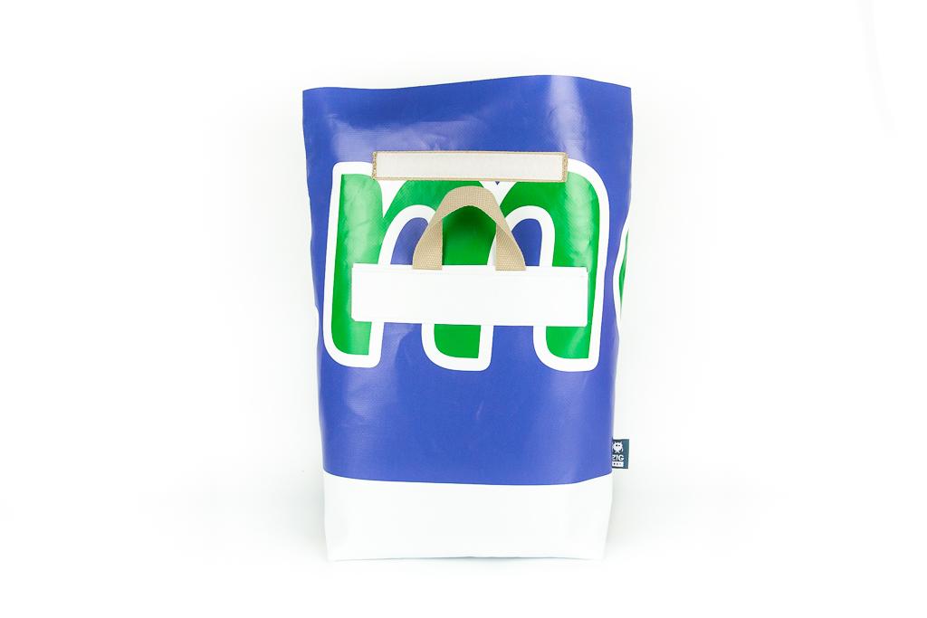 Sac imperméable blanc et bleu avec lettres jaunes et vertes. Non doublé. Anse en coton. Se ferme grâce à deux bandes velcro.